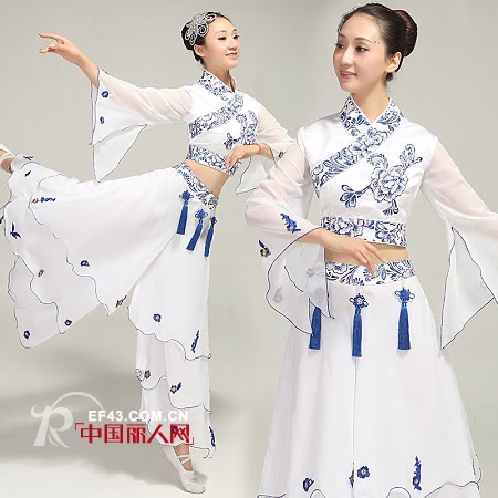 这款古典舞舞蹈服装也很漂亮,干净素雅的白色加上优雅的蓝色点缀,宛如青花瓷般雅致精美,宽松的裤腿和衣袖设计让舞者旋转跳跃间尽显柔美飘逸,小露蛮腰更添了几分妩媚性感风情,让舞者更加亮眼动人了。