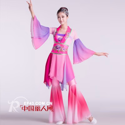 漂亮的渐变色吸睛抢镜,让舞者站在舞台的那一刻便轻松吸引住大家的视线,在款式设计上结合了中国古代女子服装的特点,然后再融入了舞蹈服装的宽袖和紧腰设计,让这款舞蹈服装即充满了古典韵味又显得飘逸浪漫。