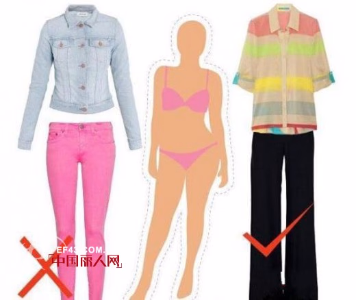 如果是臀部和大腿比较有肉的话就属于梨型身材,亚洲的女生很多都属于这种身材,尤其是经常坐在办公室和电脑前就更容易在小腹、臀部和大腿囤积脂肪。紧身裤是绝对要避免的款式,即便你拥有一双大长腿且小腿看起来纤细,但穿着这样的裤子会让你的身材显得十分失调。高腰裤让臀部的面积看起来更大,也不要轻易尝试。短款的夹克上衣或是紧身上衣也不适合梨形身材的女生,在纤巧的上半身的对比下,臀部和大腿会看起来无限的向外扩张。宽松的直筒低腰裤搭配及臀的合身上衣会让整体比例更加平衡,A字裙也是梨型身材的极佳选择。