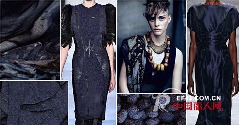 深蓝色:于纯蓝色调中掺入些许的黑色形成的深蓝,深邃且神秘,在本季成为了多种材质最广泛使用的基本选色。