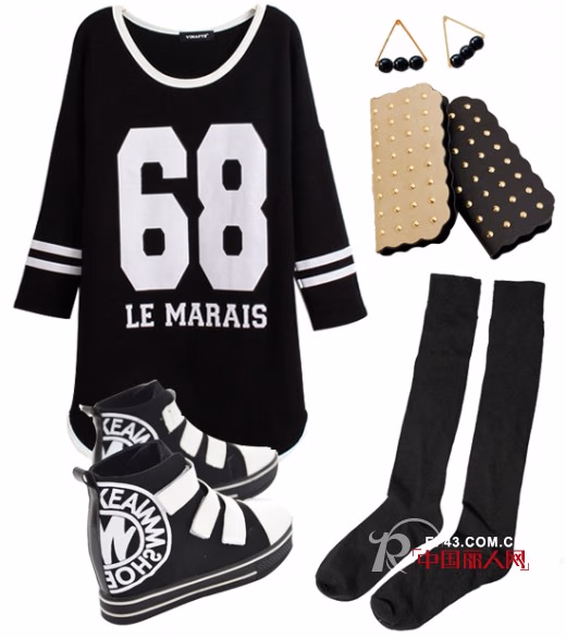 款式的版型的黑色字母印花卫衣,简约的剪裁设计却不简单,搭配上日系范的及膝袜和黑白的高帮帆布鞋,减龄又时尚,让你重回学生时代。
