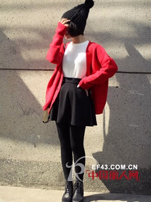 红色的针织衫开衫,绝对的亮眼,搭配上白色的T恤和黑色的半身短裙,在视觉上呈现出甜美小清新的气质。在加上黑色的丝袜和短靴,不仅在视觉上拉长了腿型,更具有保暖性。