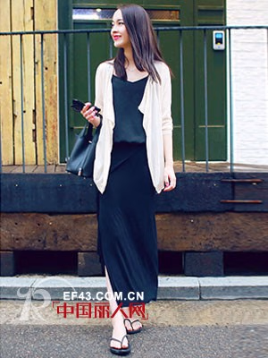 黑色的长款连衣裙,时尚又简约,搭配上米白色的针织开衫,诠释层次穿搭独特魅力,脚上穿搭简单的黑色人字拖即可,点缀手提包和墨镜,休闲漫步街头,既慵懒,但又不失气质。