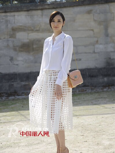如果你的搭配功底够深厚的话,不妨像这位达人一样挑战下同色系的搭配,经典白色衬衫搭配白色镂空半身裙一起穿着,显得清新淡雅而又大方时尚,当然了,搭配的时候要记得选择一款亮色系的单品来提亮整体造型哦,比如香槟色的链条包包。