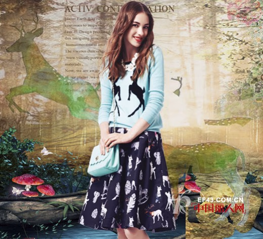 一身小鹿印染,多了几份俏皮感。天蓝色长袖卫衣,在胸前印染上一对抬前蹄的小鹿,还有在衣领上嵌入蕾丝雕花,俏皮与性感并存。下身的裙装,有着更多的小鹿印染,褶皱设计让裙摆更加宽大。如若感觉太单一,可以搭配上一款与上衣同色系的小包包也很不错。
