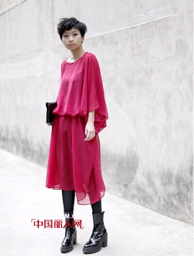 当然了,如果我们想让自己更吸睛抢镜的话,也可以选择一些亮色系的连衣裙,比如这位达人身上这款红色连衣裙就是不错的选择,宽松的版型遮肉显瘦,亮眼的红色吸睛抢镜,而轻柔的雪纺面料则增添了几分柔美女人味,混搭黑色亮面短靴一起穿着,整体look柔美妩媚中又带着几分帅酷感。