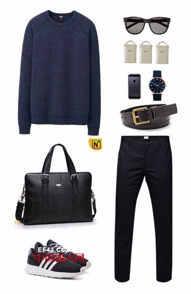 套头卫衣就比连帽卫衣稍微成熟一点,这款深蓝色的套头卫衣款式搭配一款商务手提包,配上一条休闲裤子,配上一块表,男人带表是最有品位的,这款服装搭配是秋季的最好搭配,即时尚帅气,又给商务男士多了一种穿搭。