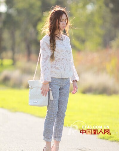 浪漫的蕾丝给人的感觉很是优雅,而镂空的设计增添了几分小性感,搭配九分印花裤一起穿着,露出纤细脚踝更添了几分小女人的秀气,整体look很是淑女甜美。