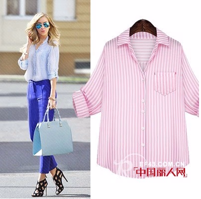 竖条纹衬衫款式搭配,两种颜色都可以跟宝蓝色想搭配,粉色和白色条纹,蓝色和白色条纹,一个是清新,一个是甜美,配上修身的宝蓝色牛仔裤,搭配一双罗马高跟鞋,绝对很有气场。