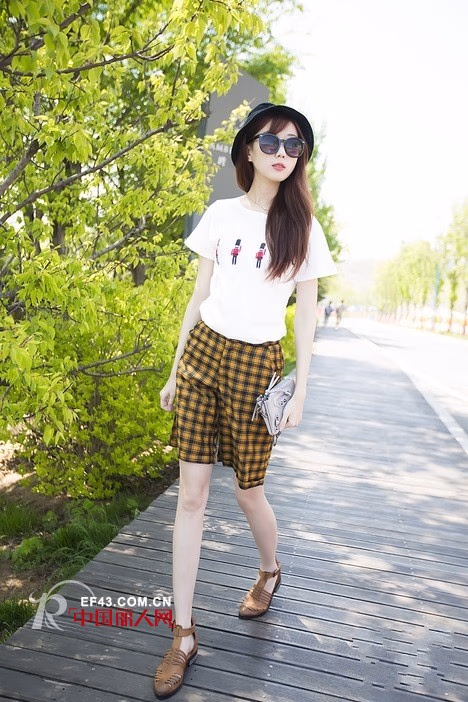 这种颜色的格子高腰裤很少见,穿着肯定不会撞衫,搭配简单的t恤就可以,搭个牛仔马甲就更出彩了。有的妞妞一定在想这款到底要搭配怎样的上衣才够酷~ 其实格子半裤已经是超赞洋气的单品了,无论是搭配怎样的T或者背心再或者衬衫都是很棒的。