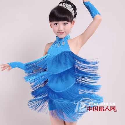 简约俏丽的丸子头,搭配着银色的皇冠,很有气质哦。这件蓝色的演出服挂脖的款式,运用着轻柔动感的流苏细节,整体随着音乐而晃动,很有韵律感。高档的质地,精致的拼接,流畅的身形,是不少小女孩喜欢的类型哦。