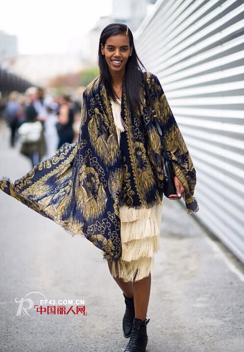 带有名族风的大披肩罩衣保暖又时尚,独特的印花图案以及暗色系的搭配十分独特,一身流苏元素的纯白连衣裙异域风情尽显!