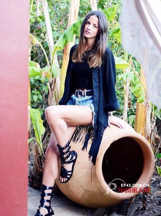 带有流苏的罩衣本来既有异域风情又充满女人味,而且十分百搭。里面简单的搭配T恤牛仔裤就很OK啦,一双镂空皮带设计的凉鞋十分抢眼,亮点就放在脚上了。