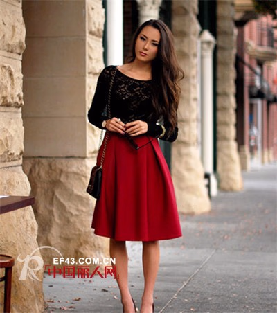 黑色蕾丝长袖衫,一种神秘的气息迎面而来。搭配着酒红色中长款伞裙,显瘦的版型,优雅气质。搭配着的黑色链条包,魅力十足。是不少爱美女性纷纷效仿的搭配风格。