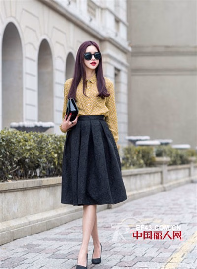 这件黑色的优雅的中长款伞裙,复古又典雅,实乃秋冬必备良品!厚重的感觉增强了女生的气场。搭配着的黄色系列长袖衫,十分应景的搭配风格。