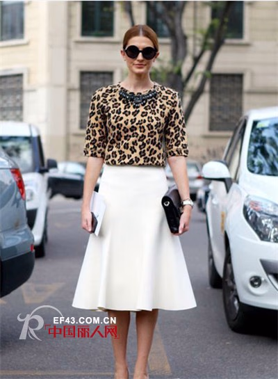 永不落幕的豹纹风一直是女王们大爱的风格,个性犀利。黑色手拿包+墨镜,更是为整体增添了霸气范儿。搭配着的白色伞裙,多了分柔和感,更是惹人喜欢。