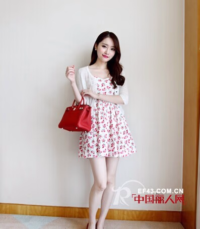 清新的碎花连衣裙给人的感觉很是甜美淑女,搭配白色针织开衫一起穿着,甜甜的女人味自然而然的就散发了出来,手上的红色手提包包更是提亮了整体造型,让我们变得更加吸睛抢镜了。
