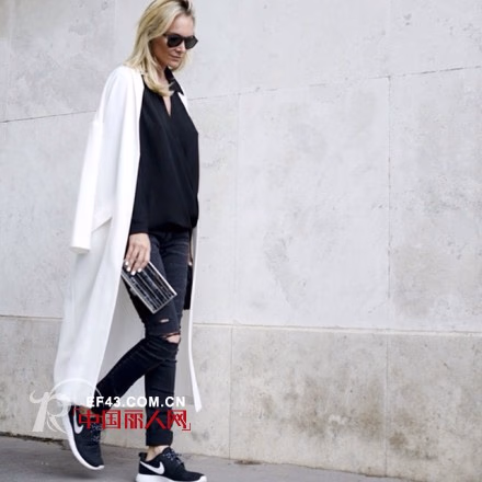 经典的颜色才是最耐看的,这款黑色衬衣搭配一件白色长款风衣,跟个白大褂一样特别的帅气,配上破洞牛仔裤,一双运动鞋,很不一样的搭配,这就是混搭。