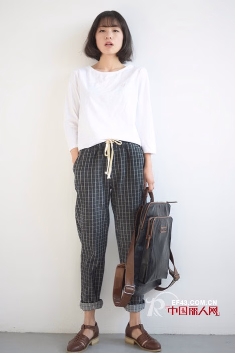 灰白格子的直筒裤,很有中性的味道,宽松的版型穿起来很是自在舒适,腰围的抽生设计穿起来很方便。而且搭配纯白色的T恤,没有夸张的效果,一切都显得是那么低调。下穿棕色的罗马凉鞋,特别能体现复古的味道。