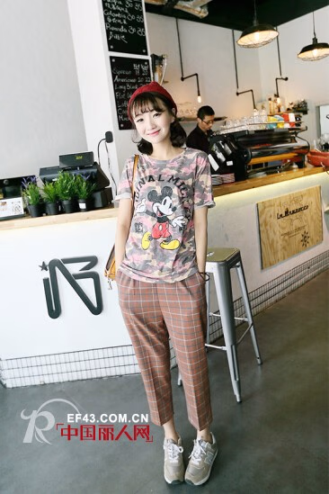 这款格子直筒裤,宽松裁剪,简单好看,给人的感觉很舒服,搭配上一件迷彩色的米奇卡通印花T恤,戴上一顶红色的毛线帽子,加上一个明黄色的仿皮挎包,休闲色彩浓厚,小爱酷酷的女生,你一定心动。