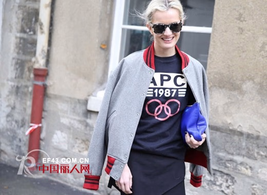 这几年重新大热的棒球外套在今年也依旧备受推崇,灰色与红色巧妙的颜色搭配不过分抢眼又不沉闷;而混搭的不规则半身裙,又出其不意被惊艳了一回,真是捉摸不透的混搭高手!