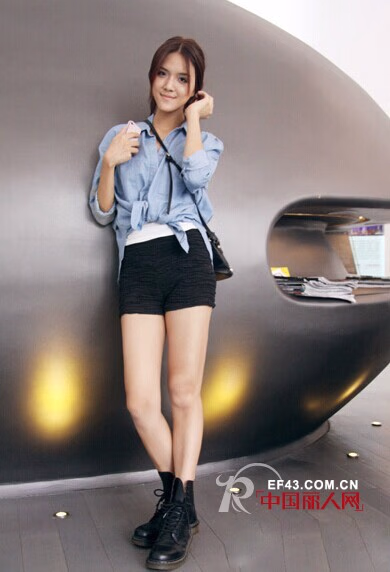 白色打底T恤搭配蓝色衬衫和黑色短裤一起穿着显得时尚休闲又不失淑女味道,搭配黑色马丁靴一起穿着更添了几分帅酷的英伦风情,让整体look更加吸睛十足了。