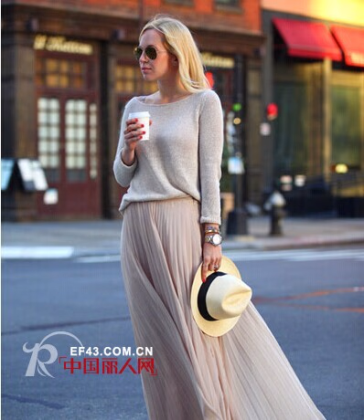 米杏色的针织衫柔美淑女而又保暖,搭配裸色雪纺半身长裙一起穿着超显女人味,时尚墨镜和帽子的加入则又为整体造型增添了几分时尚感,喜欢这身搭配的妹纸可以试试。