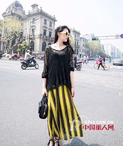 如果像现在这个时候或者九月初的话,穿针织衫可能有些太热了,那九月份的话我们可以尝试下这位达人的这身搭配,黑色吊带衫搭配黑色蕾丝罩衫,然后再搭配黑黄条纹半身裙一起穿着,整体look时尚大方而又女人味十足。