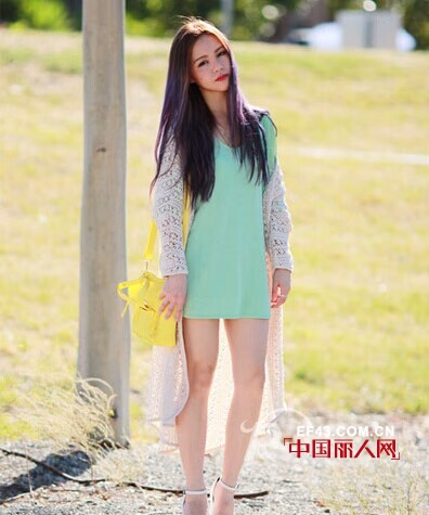 当然了,我们也可以直接选择一款夏装的连衣裙来搭配轻薄的针织开衫来一起穿着,比如这位达人的这身搭配就蛮不错,薄荷绿的连衣裙吸睛抢镜又显高挑,再加上明黄色包包点缀,整体look吸睛抢镜又时尚淑女。
