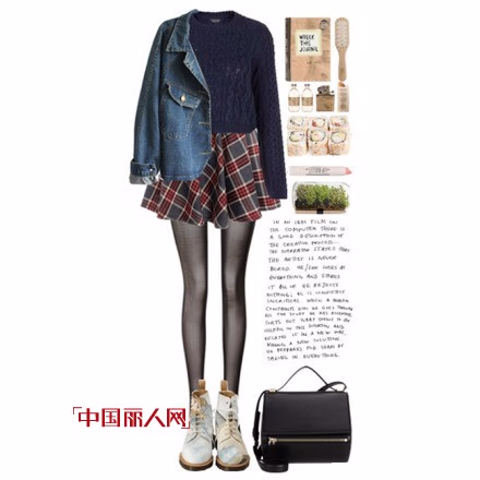 A字裙不一定是连衣裙也可以使半身裙,半身穿起来也可以很A字型,深蓝色针织衫和格子伞裙搭配,配上黑色丝袜,穿上一件宽松牛仔外套,这样的学院风,你还会担心自己的大象腿会显露吗?