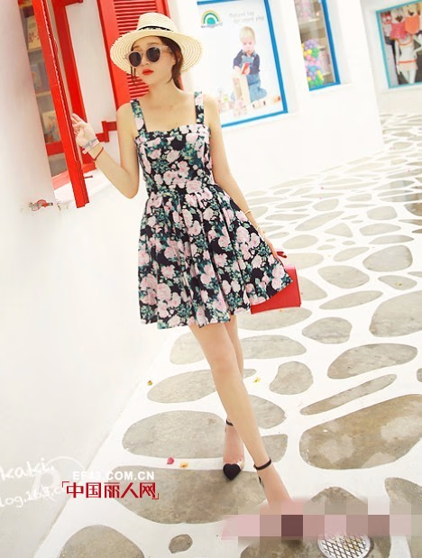 示范搭配:碎花吊带连衣裙+尖头高跟鞋