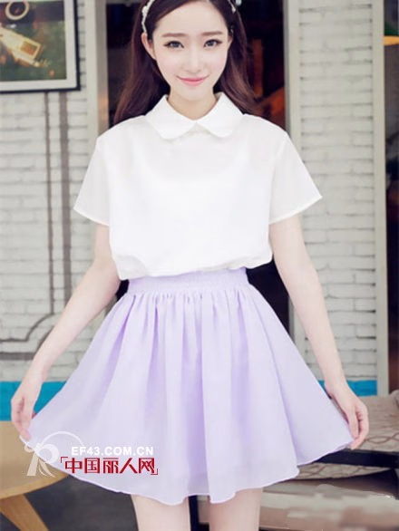 半身裙无论怎么搭配都很小清新,这款纯白色短袖衬衫款式搭配一条浅紫色半身裙,伞裙的版型更能显腿细,白色和浅紫色两个浅颜色的搭配绝对很耐看,在炎热夏季有这么清凉装扮怎能不吸睛呢?