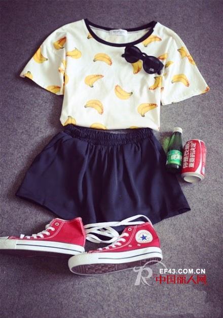香蕉T恤特别的小清新,我感觉比纯色系还要感觉小清新哦,把水果穿在身上是学院女生必备的穿搭,配上一条深蓝色雪纺裤休闲又舒适,简单又大方,瞎说呢搭配一双红色匡威的帆布鞋,怎能不减龄呢?