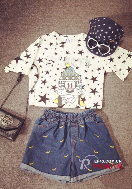 香蕉是不是很可爱呢?弯弯的像月亮,一件星星点缀的短款T恤款式搭配一条牛仔短裤,牛仔短裤上香蕉点缀绝对很赞哦,T恤配短裤,最经典的夏季穿搭,配上一个黑色小包,小清新气质可爱又俏皮。