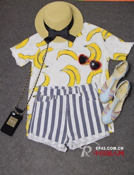 现在都是学生的放假时间,出门约会在所难免,这时应当准备一件香蕉T恤,这样就可以让你约会加分了,白色T恤上点缀满了香蕉可爱之极,配上一条条纹短裤,低调的条纹颜色,配上一双清新凉鞋,一顶编织遮阳帽时尚又可爱。