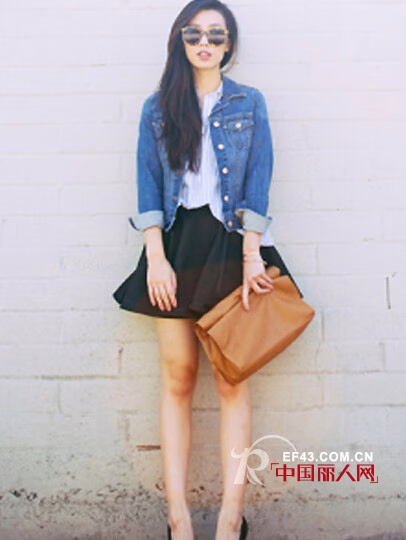 示范搭配:牛仔外套+白色上衣+黑色短裙+黑色高跟鞋+墨镜+驼色手包