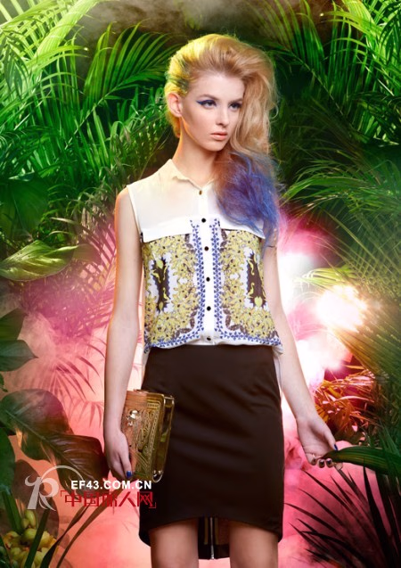 这位模特身上这套就蛮不错的,无袖雪纺印花衬衫清凉舒适又不失时尚,搭配黑色半身短裙一起穿着,整体look很是优雅大方,尽显迷人女人味,平时喜欢这种风格的妹纸可以试试这套哦!