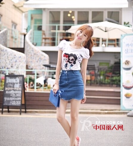 如果觉得自己一时间hold不住那么甜美淑女的风格,那你可以试试这位MM这样的搭配,卡通T恤简约大方又带着几分俏皮可爱味道,搭配牛仔包臀裙一起穿着增添了几分柔美女人味,整体look显得俏皮又不失女人味。