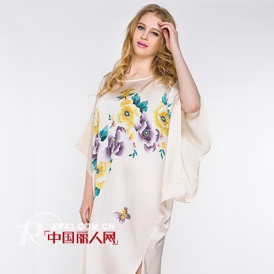 这件真丝裙宽松的版型,更加的清凉舒爽。独特的蝙蝠袖版型设计,印花的装饰,融合着今夏的潮流元素,魅力四射。炎热的夜晚,让真丝睡衣伴你度过。清爽丝滑,呵护着女人,愈发的精致美观。