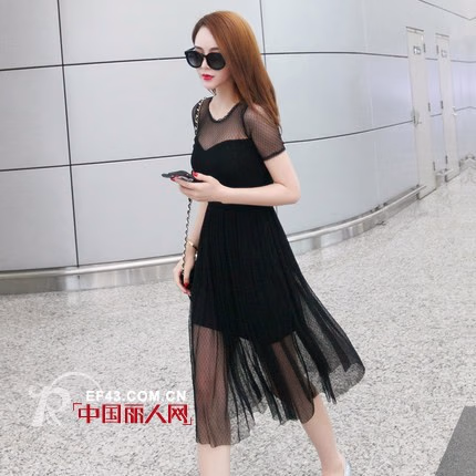 这件黑色的连衣裙是今季最流行的款式了。领处的黑色透视面料,能看到白皙的肩部,很是诱人。这件蕾丝透视性感连衣裙,抹胸的款式,网纱的裙摆十分的飘逸轻盈。搭配的黄色,酒红色直发,卷发都会很有魅力的。
