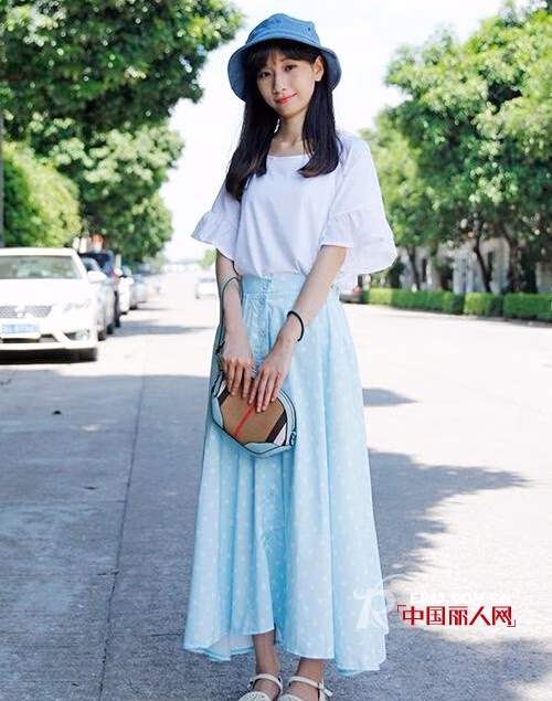 小清新也不能错过手拿包。颜色独特的贝壳造型手拿包搭配浅蓝色棉布长裙,有没有一种海边的清新感!