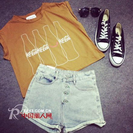 直筒的短款T恤版型配上高腰牛仔短裤,简单又个性的装扮,夏天配上衣服黑色墨镜,酷劲十足,一双经典黑色帆布鞋穿着很有学院风格,绝对减龄哦。