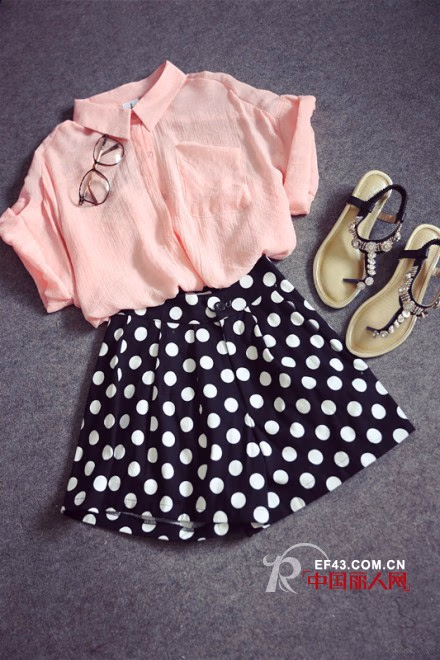 雪纺衬衫款式搭配,雪纺宽松衬衫,粉色的衬衫款式很显甜美,配上一条黑白波点伞裙,整体感觉就是给人很清新,这样的装扮在校园里怎能不吸睛,而且如果你是工作一族那么这样的版型也超减龄哦,配上一双平底凉鞋绝对赞。