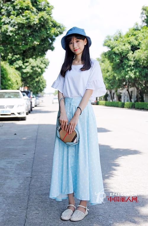 小清新也不能错过手拿包。颜色独特的贝壳造型手拿包搭配浅蓝色棉布长裙,有没有一种海边的清新感!