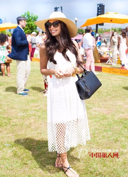 搭配 要点:沿边草帽 + 白色 镂空连衣裙 + 细带平底鞋 + 黑色 手提包