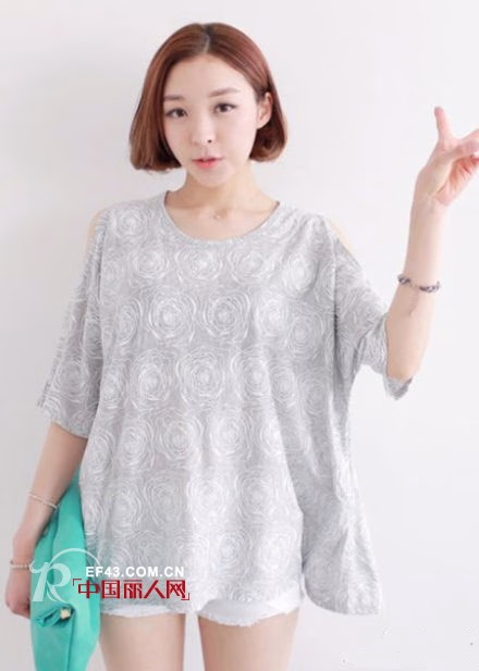 低调的灰色也可以性感,灰色露肩T恤隐约花朵点缀配上一条白色短裤,这样的装扮绝对性感,不一样的性感穿着只为夏天更美丽。