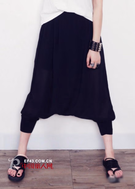这种夸张的哈伦款式搭配,黑色的夸张哈伦裤搭配,这样的吊裆裤怎能不吸睛呢?黑色的吸睛配上拖鞋,帆布鞋,上身搭配一件白色T恤就可以很吸睛了。