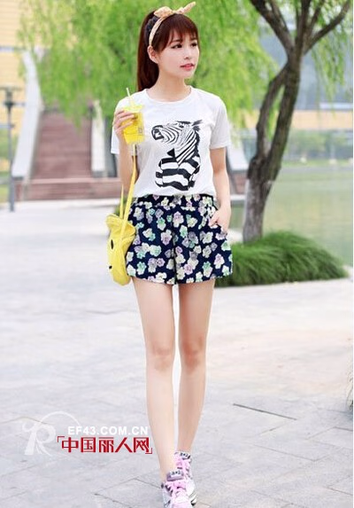 白色T恤+印花短裤,T很好搭,裤子裙子统统可以,视觉上显腿长的。鞋子是内增高的,穿起来很轻盈。