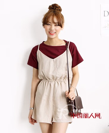简约的纯色吊带棉麻连体裤,内搭配酒红色的T恤,彰显简约时尚风范,偏薄的棉麻材质也很适合夏天,足部选择平跟的厚底凉鞋悄悄增高,又能短裤呼应凸显修长美腿。拿上手拿包,简约风小性感立显。