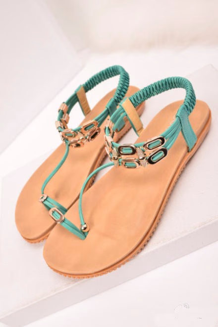 如果你喜欢穿平底鞋,那你应该知道怎么选择好看的平底鞋款式,平底凉鞋是夏季最美的搭配,平底鞋千万不能太花哨,这款薄荷绿的款式可以用带子的点缀来形容他,几根带子的连接绝对美,脚上比基尼夏天展现美脚。